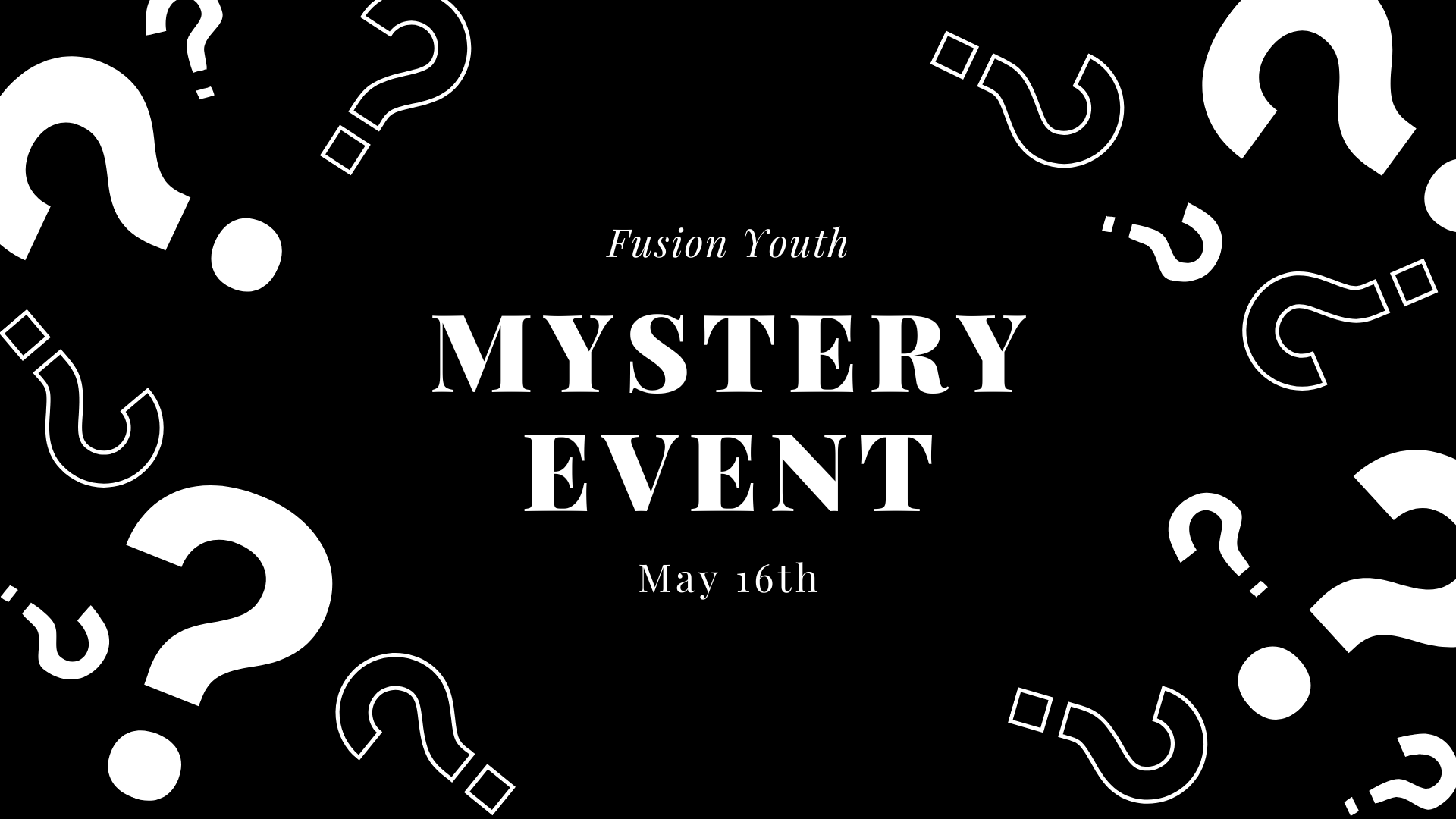 The Mystery Event is back! Fusion Youth, come spend a thrilling day with us while we puzzle and perplex you with our mystery event! This will be a day full of fun surprises for you and your friends! You won’t know what we are doing until we are already there, put together by our Fusion Youth Student Leadership Team!